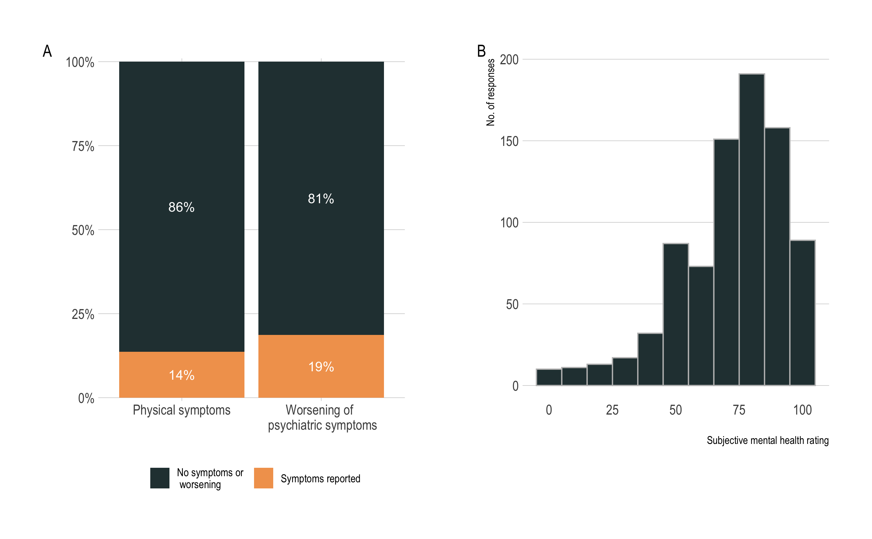 Results: Patients (n = 1071) were on average 45 years old (SD = 16.9), of which 570 (53%) were female. Neurodevelopmental disorders, psychotic disorders, and bipolar disorder were the most common diagnostic categories. The majority of respondents reported no respiratory symptoms (86%), and few reported light (10%) or severe (4%) respiratory symptoms. Similarly, most patients reported no worsening in psychiatric symptoms (81%). For those who reported a worsening of psychiatric symptoms (19%), the psychiatric management plans that were already in place were deemed appropriate in most cases (16.5%), whereas 22 patients (2.5%) reported a worsening of psychiatric symptoms that warranted an earlier or immediate follow-up by their psychiatric clinic. Patients rated their subjective mental health on a 0-100 scale as 70.5 [95% CI 69 – 71.9] on average (n = 841). Response rates to the questions of the structured assessment varied from 79% – 82%.