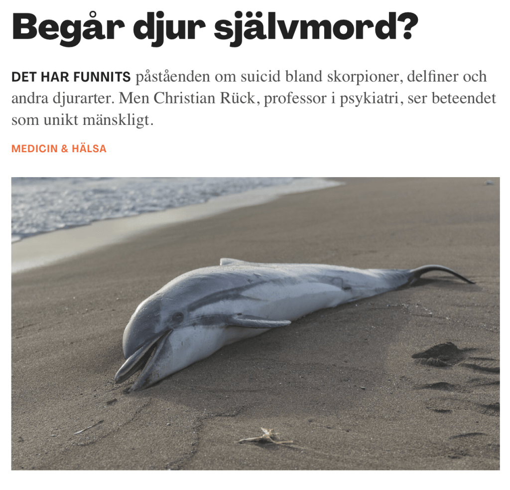 In the Swedish popular science magazine Forskning och Framsteg, Christian provides a historical review of animal suicid research. The question of whether animals commit suicide has long interested scientists, not least because it is an anomaly in the evolutionary principle of survival. However, it appears that suicide may be a phenomenon rooted in human comprehension of concepts like meaning and purposelessness, a kind of byproduct of higher cognitive abilities. Simultaneously, humans possess the resilience and capability to endure hardships and persist through challenges.