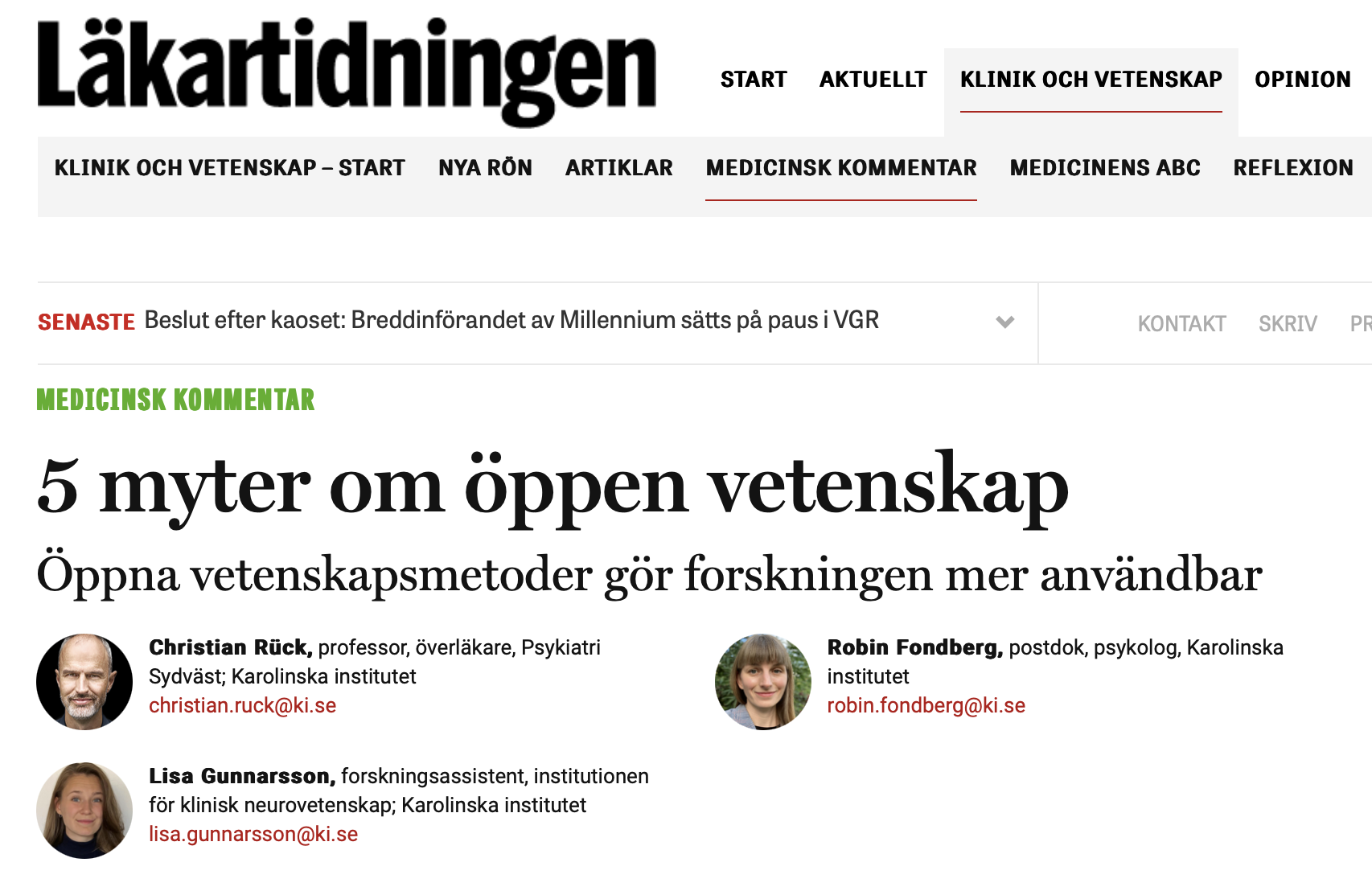 This week, Christian Rück, Robin Fondberg, and Lisa Gunnarsson contributed with an insightful commentary in Läkartidningen titled “Five Myths About Open Science”.